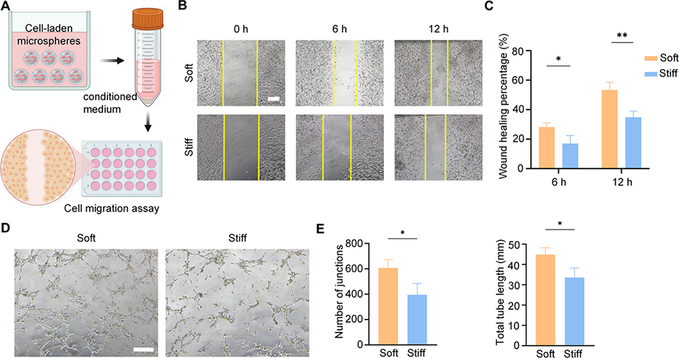 图5. 经肿瘤坏死因子 -α/ 干扰素 -γ 处理的、包封于软质甲基丙烯酰化明胶微球的间充质基质细胞可促进细胞迁移和血管生成。A)收集条件培养基用于细胞迁移实验的示意图;B)细胞在 0h、6h、12h 时的迁移代表性图像(比例尺:200μm);C)6h 和 12h 时细胞划痕区域的闭合率(n=3,*p<0.05,**p<0.01,学生 t 检验);D)人脐静脉内皮细胞管状结构形成的代表性明场图像(比例尺:200μm);E)对形成的管状结构进行定量分析,统计连接节点数(左)和总长度(右,n=3,*p<0.05,学生 t 检验)。