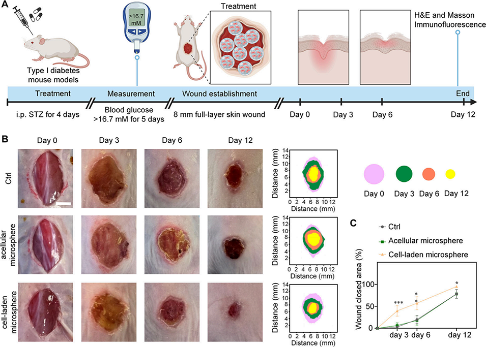 图7. 载细胞水凝胶微球经穴位给药可促进糖尿病小鼠皮肤伤口的加速修复。A)动物实验流程示意图;B)磷酸盐缓冲液对照组、无细胞微球组和载细胞微球组在 0、3、6、12 天伤口愈合过程的代表性图像(左)和示意图(右,比例尺:5mm);C)伤口愈合面积的定量分析折线图(n=3,*p<0.05,**p<0.01,***p<0.001,单因素方差分析)。