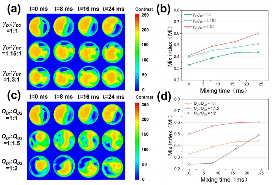 图3 基于高速相机图像提取的饱和度值,评价不同流场条件下液滴内的混合效率:(a) 分散相流速比为 1:1 时,界面张力比分别为 1:1、1:1.15 和 1:1.3 的液滴混合状态;(b) 表观混合指数随界面张力差的时间演化规律;(c) 分散相界面张力比为 1:1 时,流速比分别为 1:1、1:1.5 和 1:2 的液滴混合状态;(d) 表观混合指数随流速差的时间演化规律。