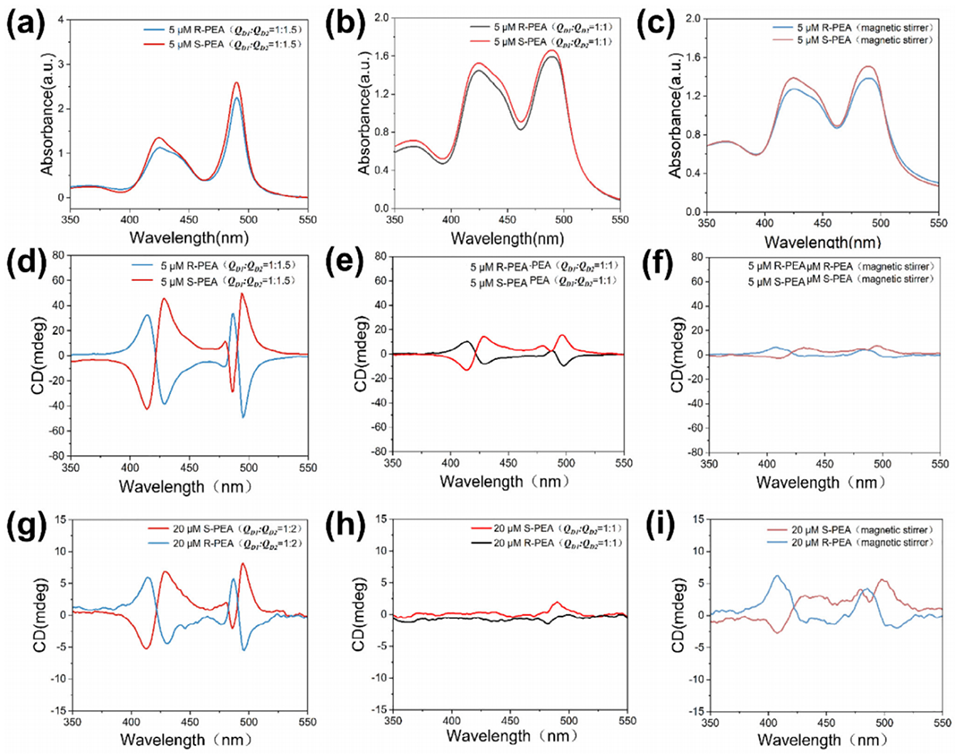 图5 TPPS4-PEA 超分子共组装体的紫外 - 可见吸收光谱与圆二色光谱:(a)-(c) PEA 存在于分散相时,不同组装条件下样品的紫外 - 可见吸收光谱 ——(a) 微液滴涡旋条件下的组装产物(样品 1);(b) 微液滴层流条件下的组装产物(样品 2);(c) 磁力搅拌条件下的组装产物(样品 3);(d)-(f) 对应组装产物的圆二色光谱 ——(d) 样品 1;(e) 样品 2;(f) 样品 3;(g)-(i) PEA 存在于连续相时,不同组装条件下样品的圆二色光谱 ——(g) 微液滴涡旋条件下的组装产物(样品 4);(h) 微液滴层流条件下的组装产物(样品 5);(i) 磁力搅拌条件下的组装产物(样品 6)。