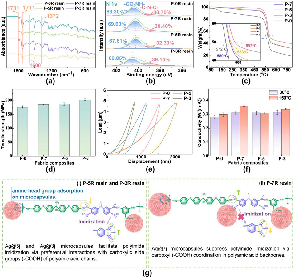 图2 (a) 聚酰亚胺树脂的衰减全反射-傅里叶变换红外光谱;(b) 聚酰亚胺树脂的 N 1s 高分辨 X 射线光电子能谱;(c) 织物复合材料的热重曲线;(d) 拉伸强度;(e) 织物复合材料的载荷-位移曲线;(f) 织物复合材料的热导率;(g) 聚酰亚胺树脂亚胺化过程的示意图。