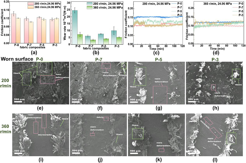 图3 (a) 织物复合材料在 200 转/分钟和 360 转/分钟旋转摩擦下的平均摩擦系数;(b) 织物复合材料在 200 转/分钟和 360 转/分钟旋转摩擦下的平均磨损率;(c) 200 转/分钟旋转摩擦下摩擦系数随时间的变化曲线;(d) 360 转/分钟旋转摩擦下摩擦系数-时间曲线;(e)–(h) 200 转/分钟下织物复合材料的磨损表面;(i)–(l) 360 转/分钟下织物复合材料的磨损表面。