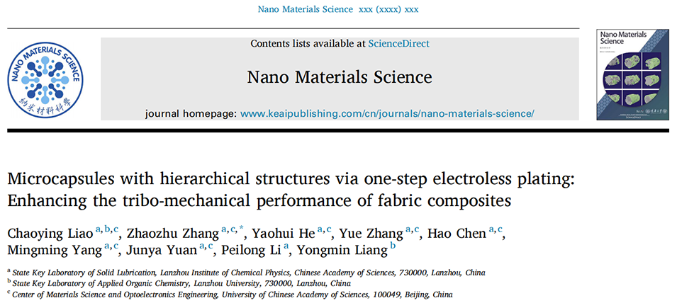 近期,中国科学院兰州化学物理研究所张招柱研究员团队以一步无电沉积法制备了具有微纳分级结构的银包覆荷荷巴油微胶囊,并将其引入PEEK/PTFE 织物增强聚酰亚胺(PI)复合材料中,系统探究了微胶囊尺寸对复合材料界面、力学、热学及摩擦学性能的影响,揭示了协同增强机制,为高性能自润滑织物复合材料的设计提供了明确思路。相关研究以“Microcapsules with hierarchical structures via one-step electroless plating: Enhancing the tribo-mechanical performance of fabric composites”为题目,发表于期刊《Nano Materials Science》。