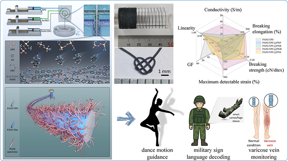 柔性智能纺织品的发展迫切需要具有高弹性、宽应变响应和环境稳定性的导电纤维。传统的聚苯胺(PANI)基复合导电纤维面临生产可扩展性低、纳米结构控制不一致以及机电性能受损等挑战,严重限制了其在智能纺织品中的实际应用。