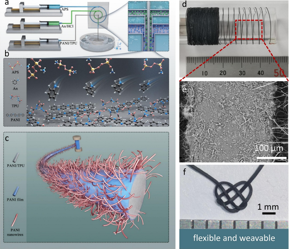 图 1. (a) PANI/TPU@PN 复合纤维的 OIPMS(在线原位聚合微流体纺丝)过程示意图。(b) 溶剂交换诱导固化和聚苯胺(PANI)原位生长的分子机制示意图。(c) PANI/TPU@PNW 纤维的示意图。(d) 连续纺丝并缠绕的 PANI/TPU@PNW 纤维照片。(e) PANI/TPU@PNW 纤维的 SEM(扫描电镜)图像。(f) 由 PANI/TPU@PNW 纤维编织的心形结照片。