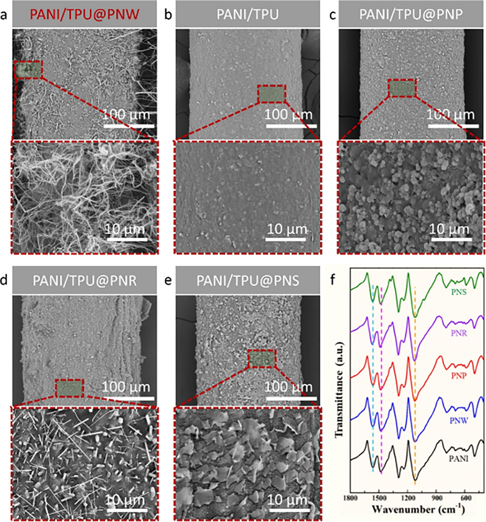 图 2. (a) PANI/TPU@PNW 纤维的 SEM 图像。(b) PANI/TPU 共混纤维的 SEM 图像。(c) PANI/TPU@PNP 纤维的 SEM 图像。(d) PANI/TPU@PNR 纤维的 SEM 图像。(e) PANI/TPU@PNS 纤维的 SEM 图像。(f) 纤维表面聚苯胺纳米结构(PN)产物的微区红外光谱。