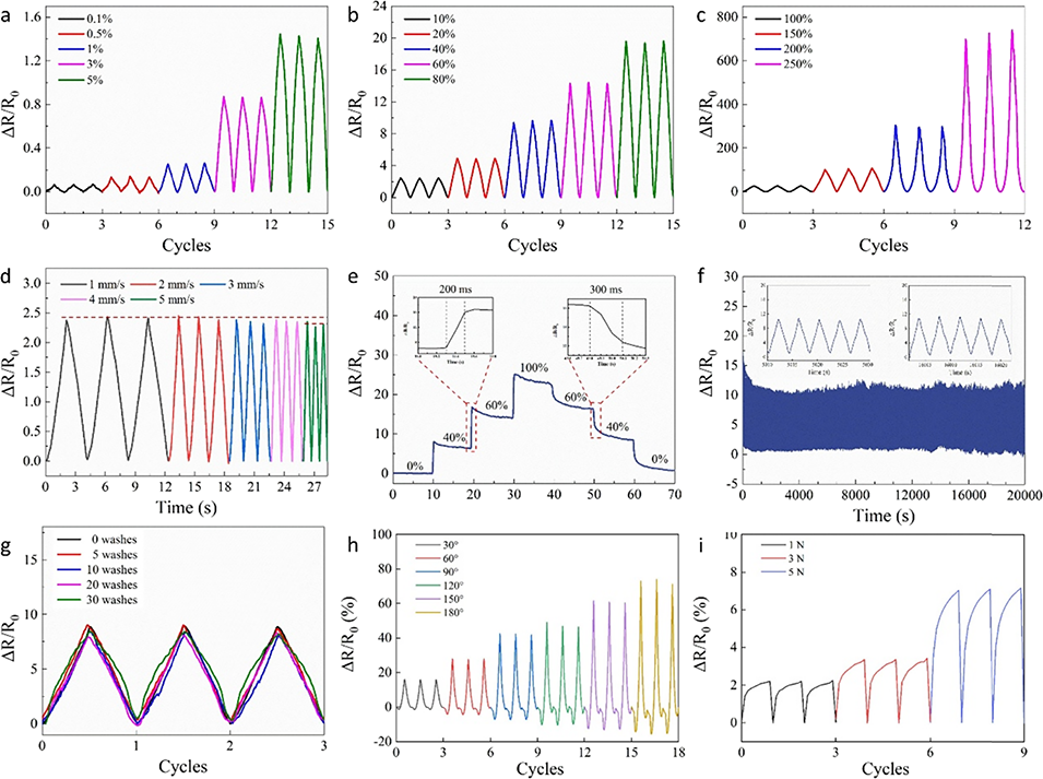 图 4. (a−c) PANI/TPU@PNW 纤维在 0.1% 至 250% 循环拉伸应变下的相对电阻变化。(d) PANI/TPU@PNW 纤维在 10% 应变下不同循环应变速率的相对电阻变化。(e) PANI/TPU@PNW 纤维在 0% 至 100% 准瞬态阶跃应变下的相对电阻变化及响应时间。(f) PANI/TPU@PNW 纤维在 50% 应变下经受 5000 次循环的相对电阻变化。(g) PANI/TPU@PNW 纤维在不同洗涤次数后的相对电阻变化。(h) PANI/TPU@PNW 纤维在不同循环弯曲角度下的相对电阻变化。(i) PANI/TPU@PNW 纤维在不同循环压力下的相对电阻变化。