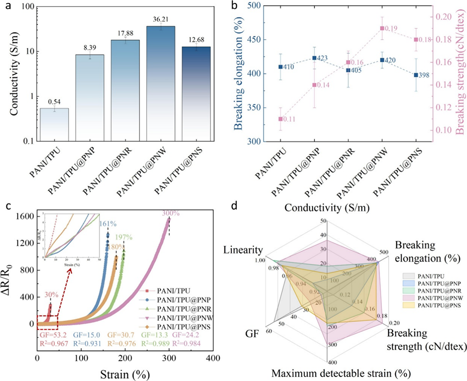 图 3. (a) PANI/TPU 和 PANI/TPU@PN 纤维的电导率。(b) PANI/TPU 和 PANI/TPU@PN 纤维的力学性能。(c) PANI/TPU 和 PANI/TPU@PN 纤维的相对电阻变化-应变曲线,图中标记了最大检测应变,以及第一线性应变区间的 GF 值(灵敏因子)和线性度。(d) 展示 PANI/TPU 和 PANI/TPU@PN 纤维综合性能的雷达图。