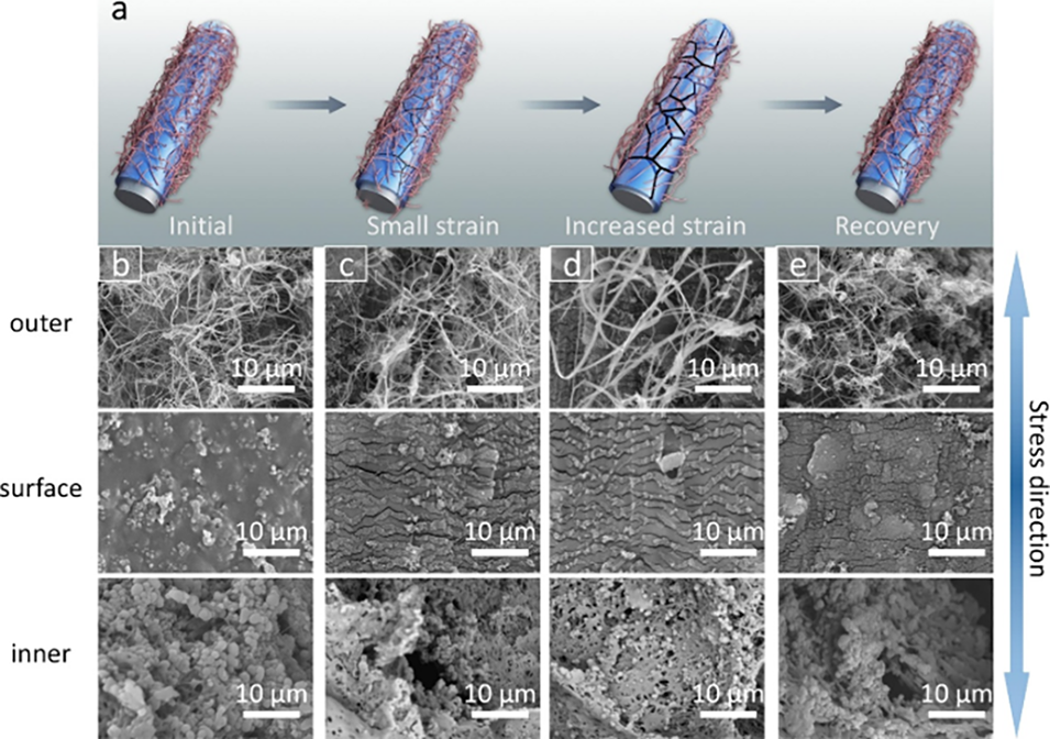 图 5. (a) PANI/TPU@PNW 纤维的拉伸应变传感机制示意图。(b) 初始状态下纤维从外层到表面再到内部的 SEM 图像。(c) 小应变下纤维的 SEM 图像。(d) 大应变下纤维的 SEM 图像。(e) 应力释放后纤维的 SEM 图像。