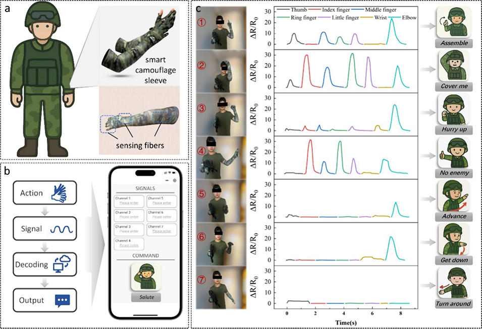 图 7. PANI/TPU@PNW 传感纤维在智能迷彩袖套中的应用。(a) 智能迷彩袖套的外观及传感纤维的布局。(b) 信号采集、输出过程及显示页面。(c) 七种标准军事手语的信号特征与识别结果。