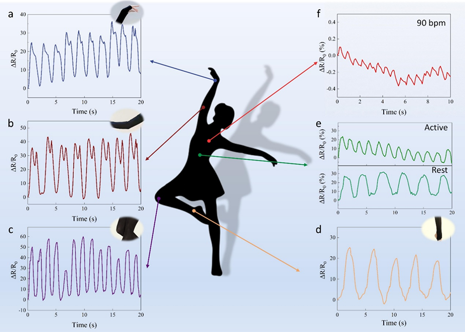 图 6. PANI/TPU@PNW 传感纤维在智能舞蹈服中的应用。(a) 手腕动作。(b) 肘部动作。(c) 膝盖动作。(d) 脚踝动作。(e) 运动和休息时的呼吸信号。(f) 心跳信号。