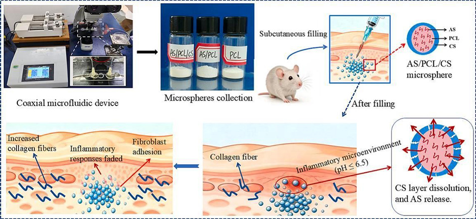 该研究将系统表征该微球的理化性质,评价其体外生物相容性,并通过体内实验验证其促胶原再生与抗炎效果,旨在为组织修复与再生医学领域提供一种更安全、更长效的面部抗衰老方案。相关工作以“The pH-dependent injectable chitosan-coated AS/PCL microspheres prepared by coaxial microfluidic technology with collagen-regenerative effects”为题目,发表在期刊《European Polymer Journal》上。
