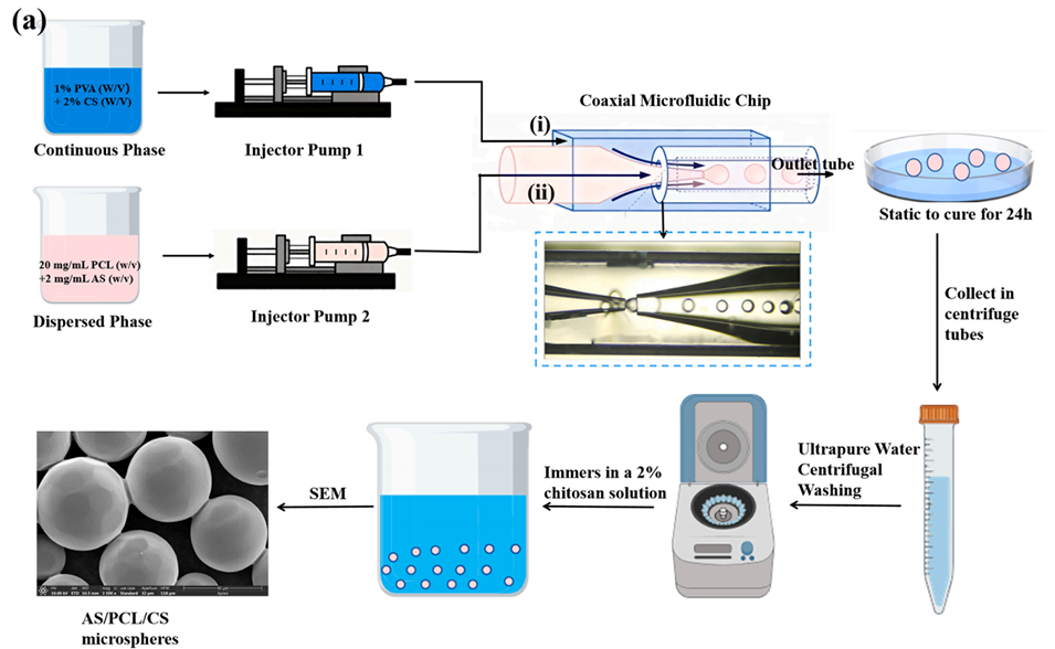 基于此,贵州中医药大学药学院王立红教授团队采用同轴微流控技术构建了壳聚糖(CS)包覆的可注射型黄芪甲苷/聚己内酯(AS/PCL)皮下微球填充剂。以聚己内酯(PCL)作为载体支架,凭借其缓释特性与促胶原潜能,为黄芪甲苷(AS)提供长效递送基础;负载黄芪甲苷(AS)以发挥其 “促胶原再生 + 抗炎” 的双重生物活性;采用壳聚糖(CS)包覆以改善聚己内酯(PCL)的疏水性,提升细胞黏附能力与生物相容性,同时利用壳聚糖的 pH 响应性实现药物在炎症部位的精准释放;最后借助同轴微流控技术的精准调控优势,保障微球粒径均一、表面光滑,满足面部填充剂的可注射性与长期留存要求。