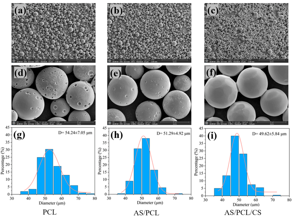 图2 微球的扫描电镜图及粒径分布图。(a-c) 依次为 PCL 微球、AS/PCL 微球、AS/PCL/CS 微球(250 倍放大);(d-f) 依次为 PCL 微球、AS/PCL 微球、AS/PCL/CS 微球(3500 倍放大);(g-i) 依次为 PCL 微球、AS/PCL 微球、AS/PCL/CS 微球的粒径分布图
