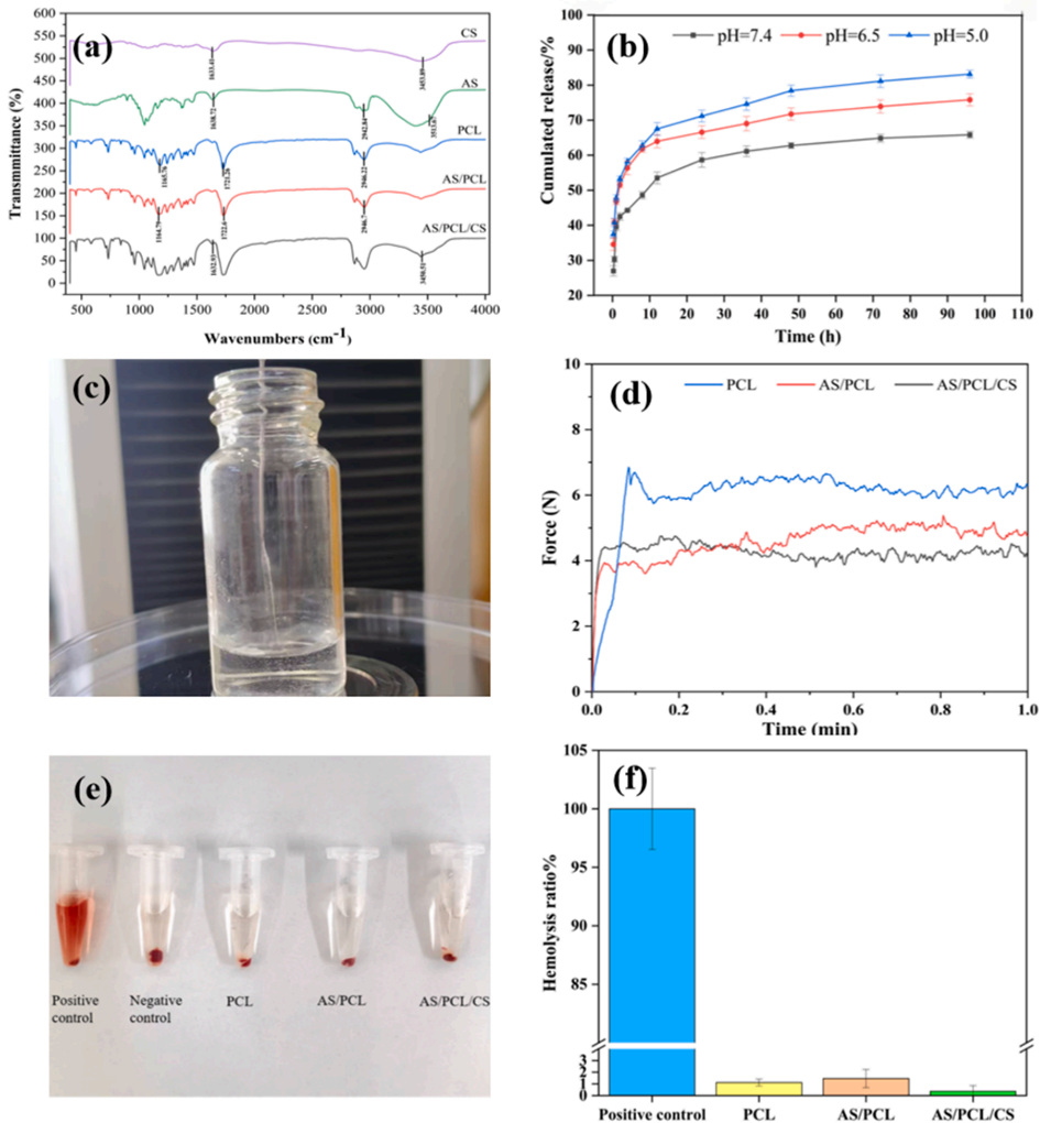 图4 (a) 各样品的傅里叶变换红外光谱图;(b) AS/PCL/CS 复合微球的体外释药曲线;(c) 微球可注射性测试照片;(d) 微球的注射力测试结果;(e) 溶血实验图;(f) 溶血率柱状图(n=3)