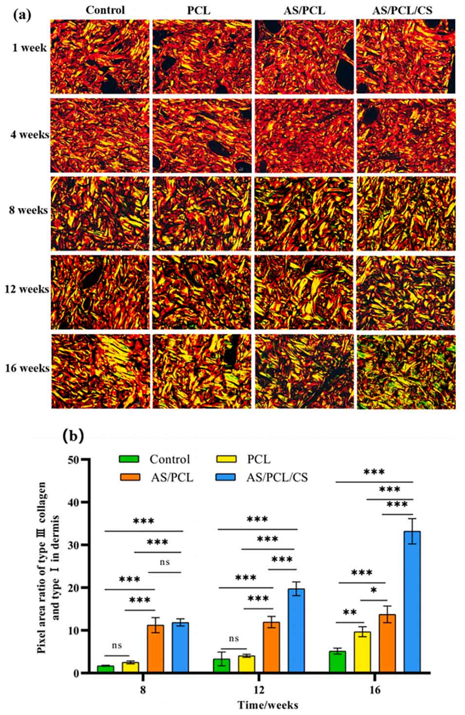 图7 (a) 注射生理盐水、PCL 微球、AS/PCL 微球、AS/PCL/CS 微球后不同时间点,大鼠真皮层天狼星红染色的组织学评价(标尺:10μm);(b) 各组真皮层 Ⅲ 型胶原的像素面积比。ns 表示无统计学差异;* 表示 p<0.05,** 表示 p<0.01,*** 表示 p<0.001(n=3,单因素方差分析后进行 Tukey 事后检验,ns 表示无统计学差异;* 表示 p<0.05;** 表示 p<0.01;*** 表示 p<0.001)