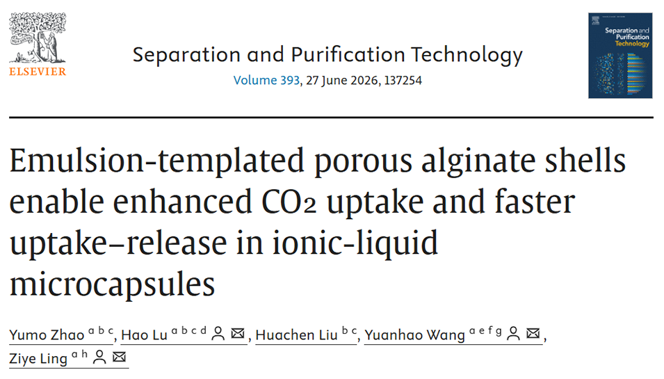近期,新疆大学卢浩教授团队联合华南理工大学凌子夜教授、北京科技大学汪逺昊教授等人在《Separation and Purification Technology》期刊上发表了题为“Emulsion-templated porous alginate shells enable enhanced CO₂ uptake and faster uptake–release in ionic-liquid microcapsules”的研究成果。这篇文章介绍了一种用于二氧化碳捕集的高效离子液体微胶囊制备技术。研究人员开发出一种全水相乳化联合冷冻干燥的方法,将离子液体 [BMIM][BF₄] 包裹在海藻酸钠基质中,成功制造出具有多级孔隙结构的 ESA-IL 微胶囊。