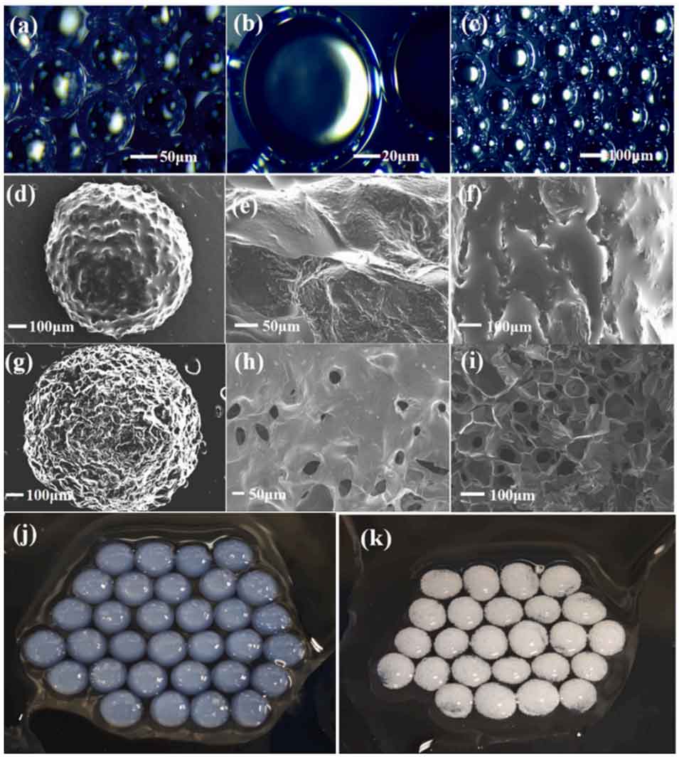 图2 从乳化前驱体到冷冻干燥后 SA–IL 与 ESA–IL 微胶囊的形貌演变。(a–c) 吐温 80 稳定的乳液光学显微图像,显示液滴分散均匀、粒径分布窄;(d–f) 非乳化 SA–IL 微胶囊的扫描电镜图像:整体形貌 (d)、光滑致密的表面 (e)、密实的截面 (f);(g–i) 乳化辅助制备的 ESA–IL 微胶囊扫描电镜图像:壳层褶皱的类球形颗粒 (g)、布满凹坑与沟槽的多孔表面 (h)、具有连通空腔的截面 (i);(j,k) 冷冻干燥前湿态 SA–IL (j) 与 ESA–IL (k) 凝胶微球的光学图像,表明大部分开孔孔隙是在冷冻与升华过程中形成,而非凝胶化初始状态。