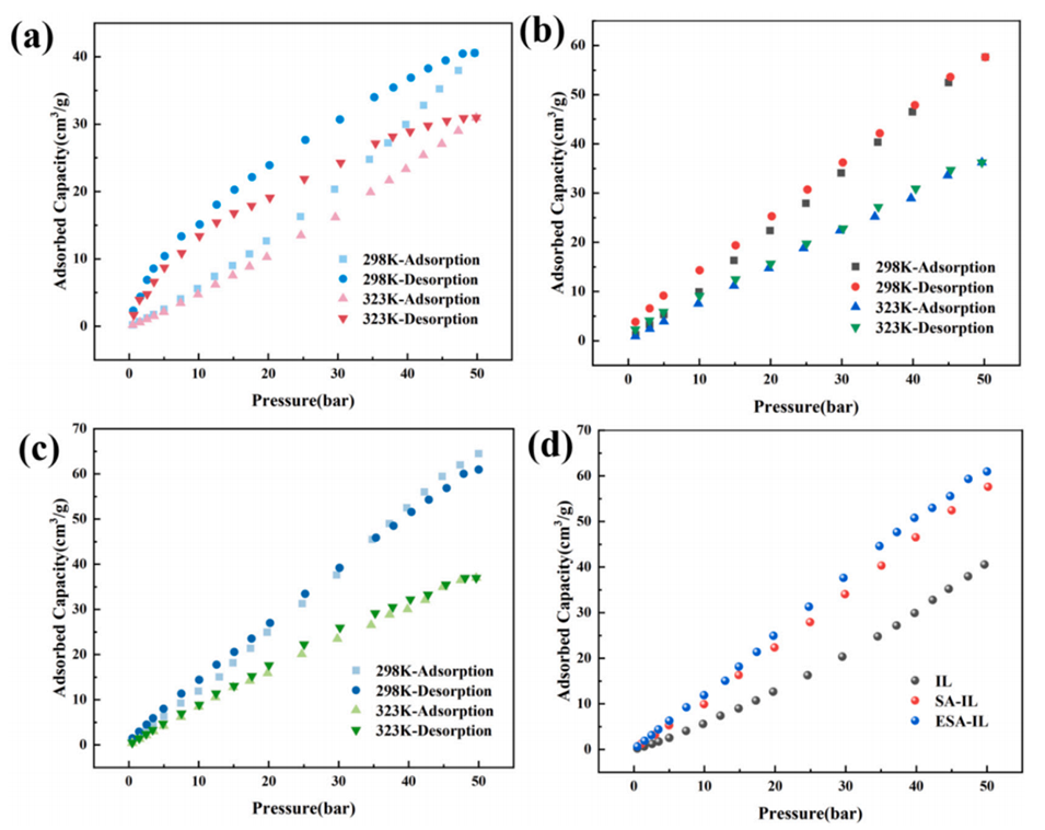 图4 纯离子液体、SA–IL 与 ESA–IL 微胶囊的高压 CO₂吸附性能。(a) 纯 [BMIM][BF₄] 在 298 K 和 323 K、0–50 bar 条件下的 CO₂吸附–解吸等温线;(b) SA–IL 微胶囊在 298 K 和 323 K 下的 CO₂吸附–解吸等温线;(c) ESA–IL 微胶囊在 298 K 和 323 K 下的 CO₂吸附–解吸等温线;(d) 298 K 下纯离子液体、SA–IL 与 ESA–IL 的 CO₂吸附等温线对比,凸显 ESA–IL 在 0–50 bar 全压力范围内吸附容量的提升。