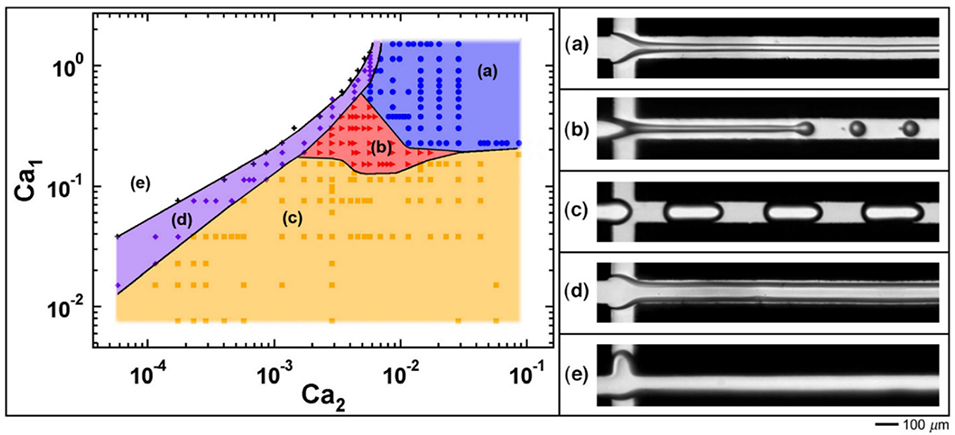 图 3. 左图:双 T 型结的流动图谱,以分散相的毛细管数 Ca₁和连续相的毛细管数 Ca₂为变量。右图:双 T 型结中不同流态下生成液滴的实验快照:(a) 穿流型(●)、(b) 射流型(")、(c) 滴液型(■)、(d) 管状流型(◆)、(e) 粘性置换型(+)。