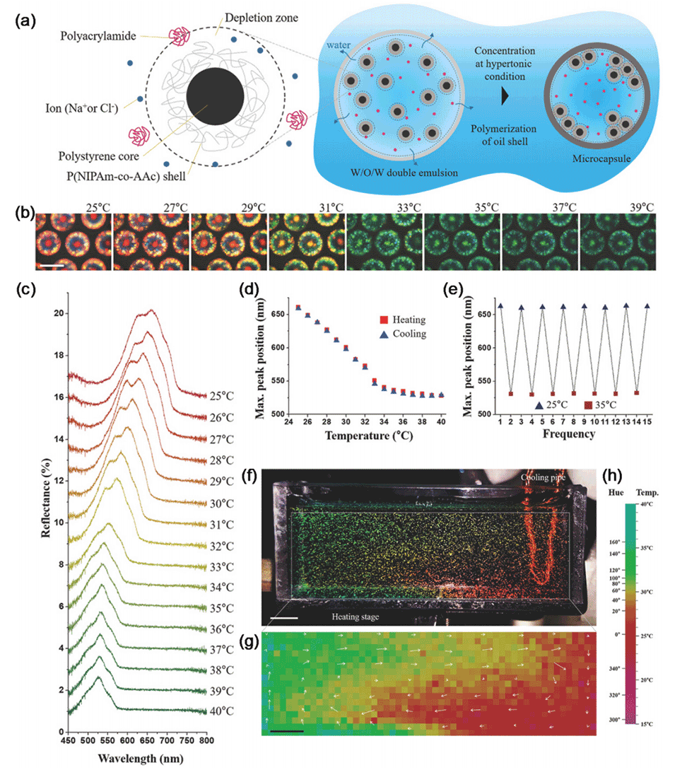图 9. 基于胶体颗粒的热响应材料,通过 W/O/W 双乳液的耗尽诱导相分离生成。(a) 组成 W/O/W 液滴水核的热响应颗粒示意图(左图)。该颗粒由 PS 核和 p (NIPAm-co-AAc) 壳组成。右图说明通过高渗处理实现液滴水核的浓缩和相分离机制。(b) 不同温度下颗粒的光学显微图,显示颜色变化。比例尺:200μm。(c) 不同温度下的反射光谱。(d) 加热(红色方块)和冷却(蓝色三角形)时反射光谱峰值波长与温度的关系。(e) 样品温度在 25–35℃循环变化时反射光谱峰值波长的变化。(f) 热敏感颗粒悬浮在水介质中并包含在具有温度梯度的对流池中的照片。加热台位于图的左下角,冷却管位于右上角。比例尺:5mm。(g) 对流池中颗粒的色调和速度值的二维图。色调值在标记为矩形的区域中计算。速度图由白色箭头表示,箭头头部指示速度方向,长度表示速度大小。速度图在 2s 的时间间隔内计算。比例尺:5mm。(h) 色调值与温度的对应关系。