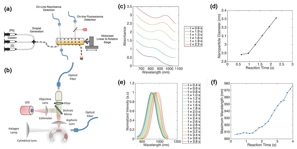 图 8. (a) 在液滴微流控设备中合成 PbS 量子点(QDs)并通过吸收和荧光光谱进行实时原位监测的系统示意图。(b) 用于原位测量吸收和光致发光(PL)光谱的实验装置。(c) 和 (d) 不同反应时间下 PbS 量子点吸收光谱 (c) 和纳米颗粒直径 (d) 的时间演化。(e) 和 (f) 不同反应时间下 PbS 量子点荧光光谱 (e) 和相应峰值波长 (f) 的时间演化。(c)-(f) 中的数据在 120℃下获得。