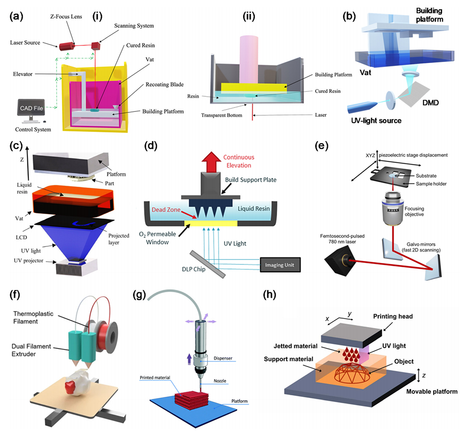 图 12. 基于以下技术的 3D 打印技术示意图:(a) 具有上下曝光配置的 SLA (i) 和 (ii)、(b) DLP、(c) LCDP、(d) CLIP、(e) TP-SLA、(f) FDM、(g) DIW、(h) 材料喷射。