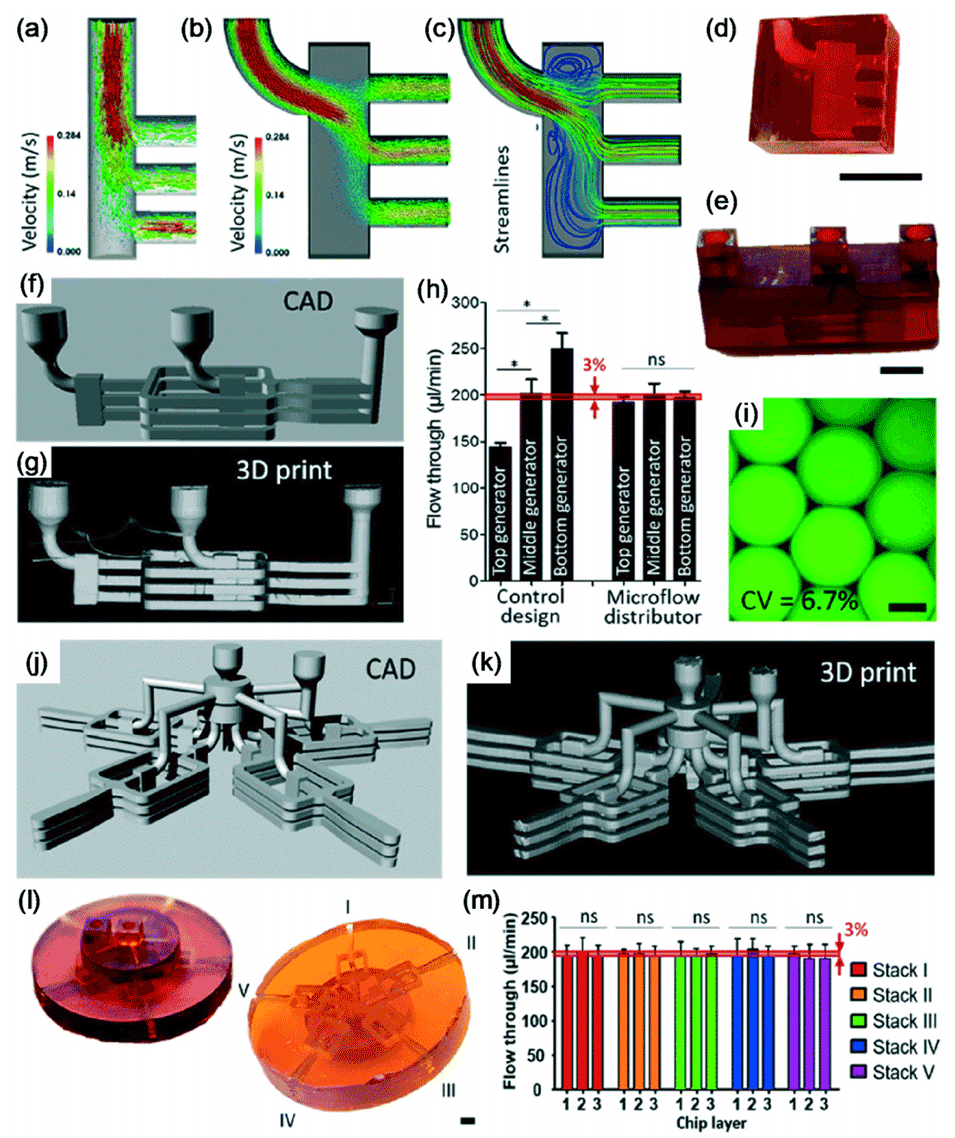图 15. (a)-(c) 三个堆叠通道中流动的数值模拟,这些通道通过常规通道 (a) 和计算优化的流动分配器 (b,c) 连接。(d) 和 (e) 3D 打印堆叠通道 (d) 和具有三个堆叠液滴发生器的设备的照片。比例尺:500μm。(f) CAD 模型和 (g) 通过 μCT 获得的具有三个堆叠液滴发生器的设备的 3D 分析。(h) 在具有常规分配器(“控制设计”)和计算优化的流动分配器的三个堆叠液滴发生器中测量的流量。(i) 荧光素掺杂的水在油中的液滴显微图。比例尺:100μm。(j) 具有 15 个液滴发生器的设备的 CAD 模型和 (k) μCT 分析。(l) 3D 打印设备的照片。比例尺:200μm。(m) 在 15 个并行化液滴发生器中测量的流量。