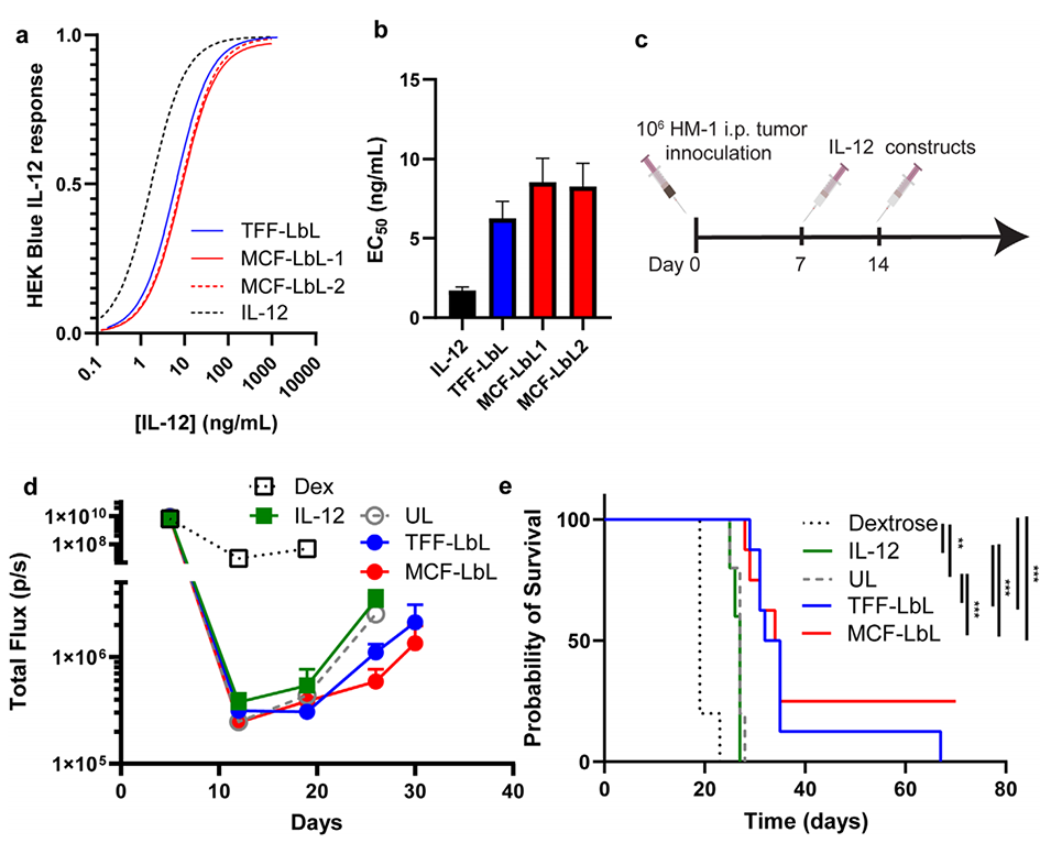 图 5. 微流控层层组装纳米颗粒在体外保持白细胞介素12的生物活性,并在转移性卵巢癌小鼠模型中显示出体内有效性