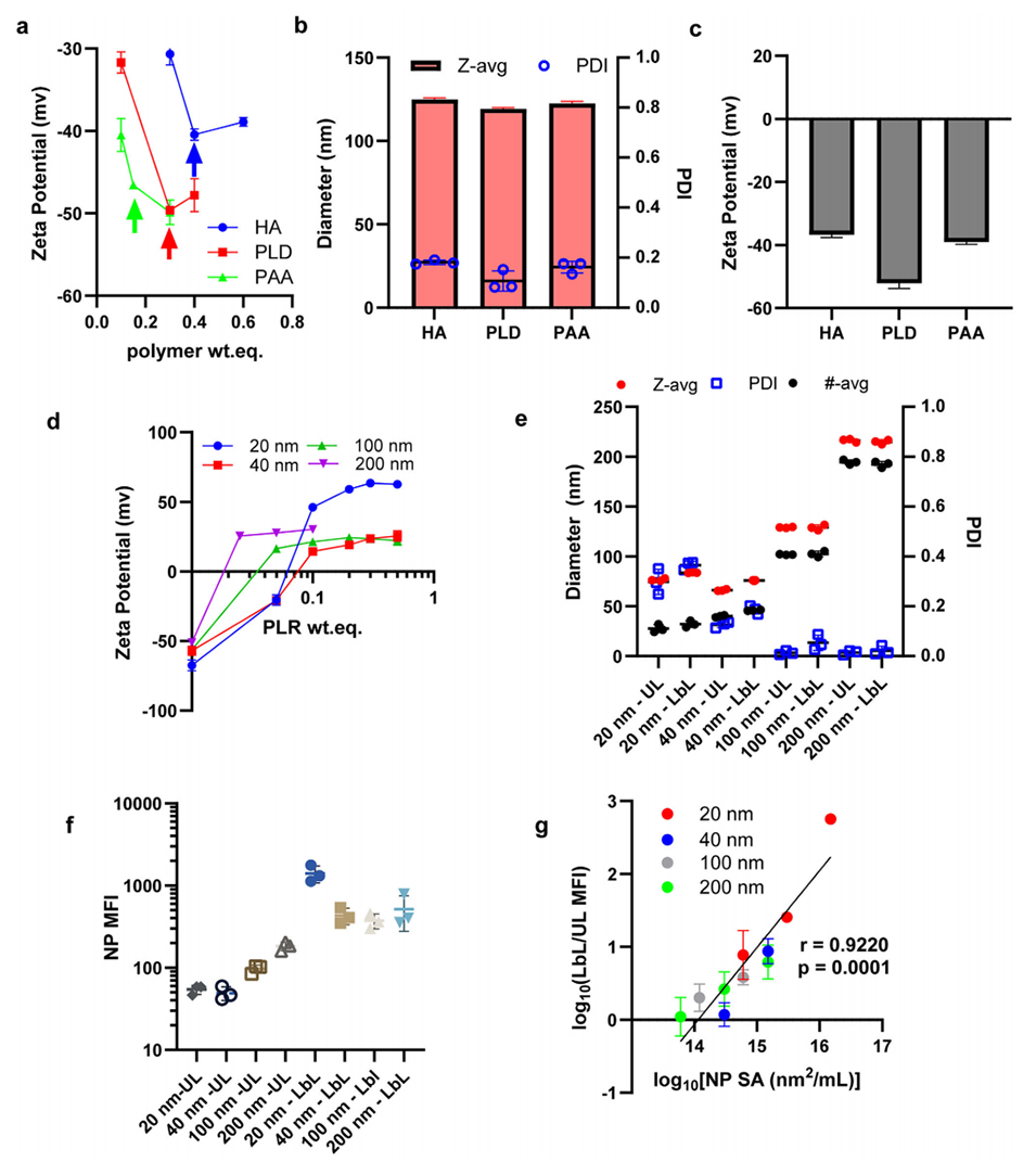 3、该方法通过精确控制聚合物与纳米颗粒的重量当量比,在无需过量聚合物的条件下实现表面电荷转换,避免了传统方法中耗时的纯化步骤,显著提高了LbL-NPs的制备效率和产量。