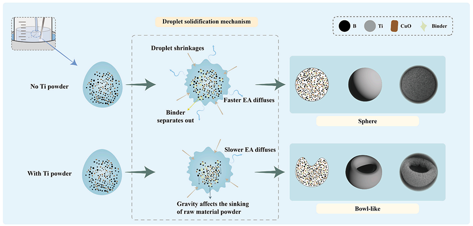 在溶剂持续扩散与粘结剂固化过程中,原料粉末(B、Ti、CuO)随粘结剂的析出逐渐紧密结合,最终形成具有特定结构的微球:无Ti时,B与CuO颗粒迁移速率快,乙酸乙酯扩散均匀,易形成球形微球;加入Ti后,因Ti密度高于B且增加分散相粘度,原料颗粒迁移速率减缓、自重沉降效应增强,微球顶部易塌陷形成碗状结构。最终定型的微球中,B、Ti、CuO颗粒均匀分布(为后续合金化反应提供接触基础),且内部因溶剂扩散留下多孔结构,既保障了原料混合均匀性,又为燃烧时的热量/质量传递创造条件。