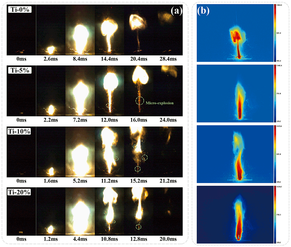 3、点火实验显示,微球及其压装药柱均能实现自持燃烧,火焰温度和燃烧速率随着 Ti 粉末含量的升高而增加,但Ti过量(>10%)会影响燃烧稳定性。