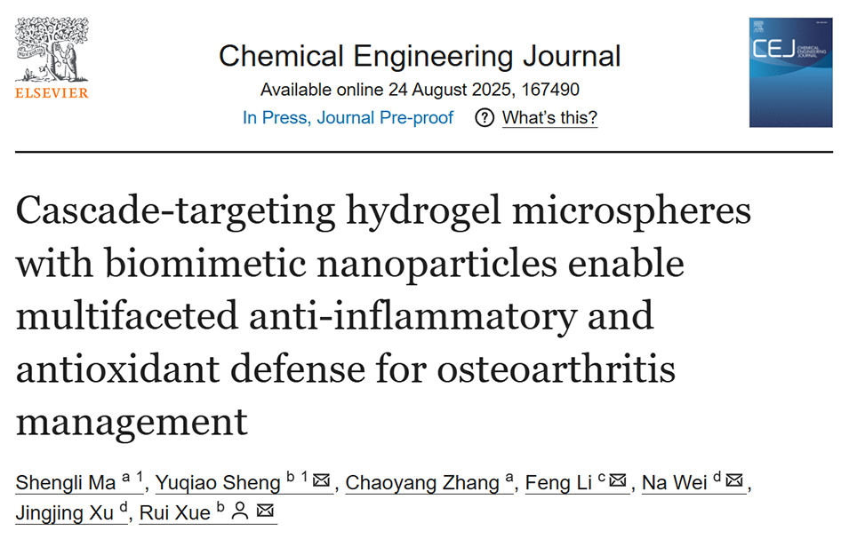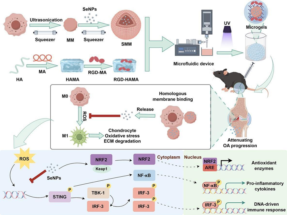 近期,郑州大学第一附属医院研究团队开发出一种级联靶向水凝胶微球系统(SMM@HMs),该系统通过负载巨噬细胞膜包裹硒纳米颗粒的仿生纳米颗粒,实现关节内长效滞留、巨噬细胞精准靶向及活性氧清除,进而调控巨噬细胞极化并保护软骨细胞。相关研究以“Cascade-targeting hydrogel microspheres with biomimetic nanoparticles enable multifaceted anti-inflammatory and antioxidant defense for osteoarthritis management”为题目,发表在期刊《Chemical Engineering Journal》上。
