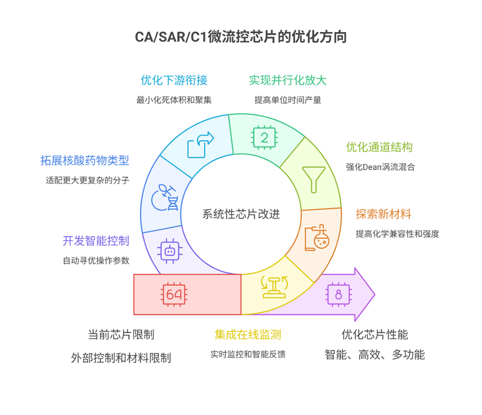 图 1:基于环形非对称分割重组(CA/SAR)混合原理,利用设计的 CA/SAR 微通道与 CA/SAR/C1 芯片实现高质量一致性脂质纳米颗粒(LNPs)制备的扩展策略图。
