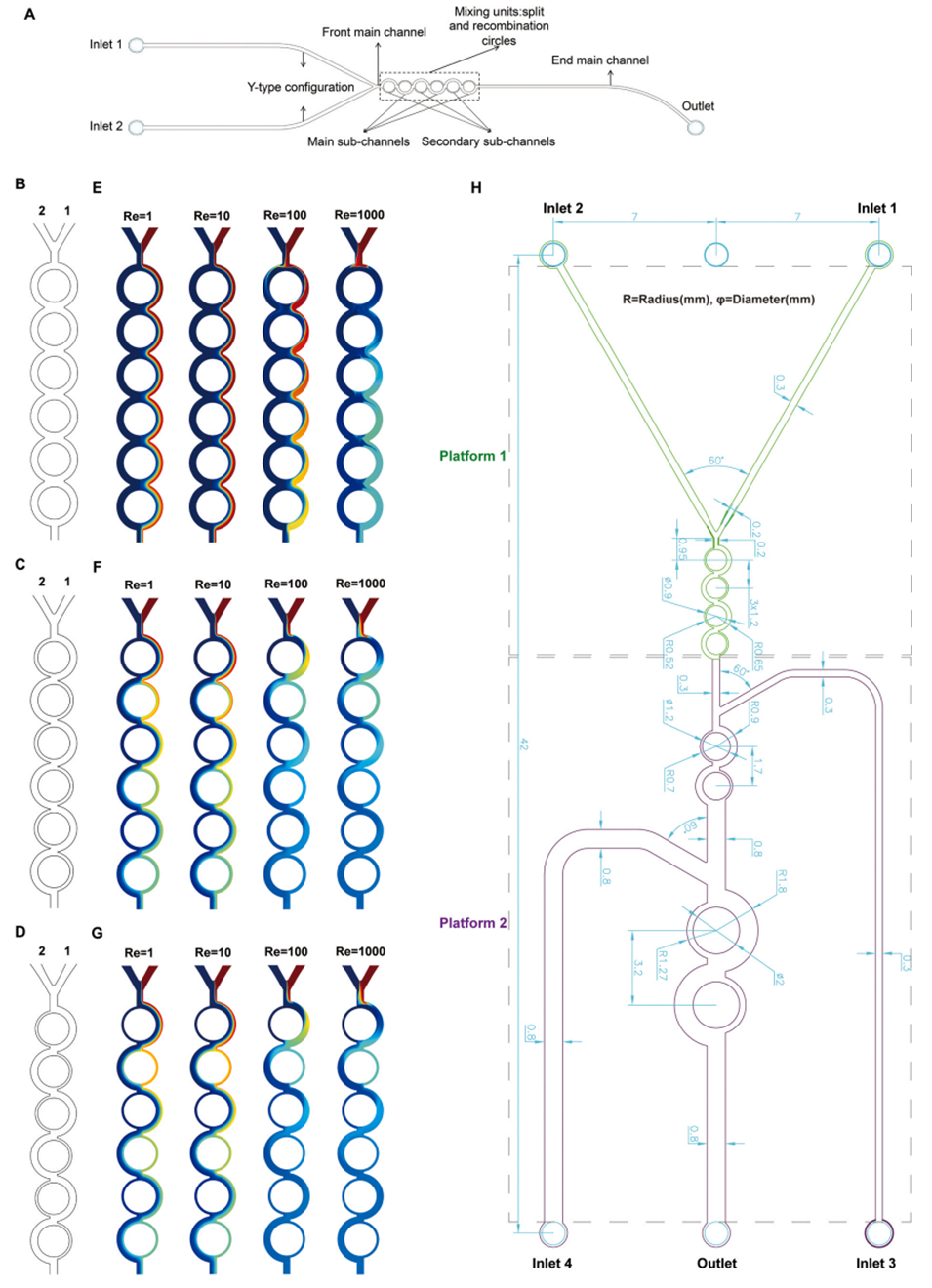 图 2:(A)候选环形分割重组(SAR)微通道示意图;(B-D)三种候选微通道(分别命名为 A 型、B 型、C 型)的结构,其主通道宽度(W1)与副通道宽度(W2)的比例分别为 1:1、2:1 和 3:1;(E-G)A 型、B 型、C 型微通道在不同雷诺数(Re)下的单独混合行为;(H)CA/SAR/C1 芯片的内部通道结构。