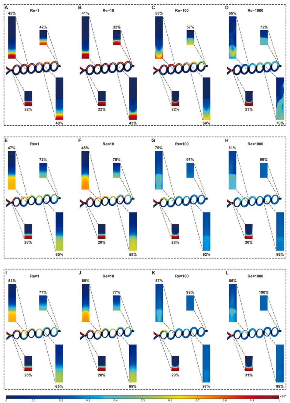 图 4:A 型(A-D)、B 型(E-H)、C 型(I-L)微通道在 0 号、2 号、4 号、6 号横截面(分别对应 0、2、4、6 次循环)处的混合性能对比图。结果表明,采用环形非对称分割重组(CA/SAR)设计的 B 型和 C 型微通道混合性能显著更优:当雷诺数(Re)超过 100 时,B 型微通道仅需 4 次循环、C 型微通道仅需 3 次循环即可实现完全混合(混合指数 MI>90%);且具有更高不对称比例(W1/W2=3:1)的 C 型微通道,其性能优于 B 型微通道(W1/W2=2:1)。