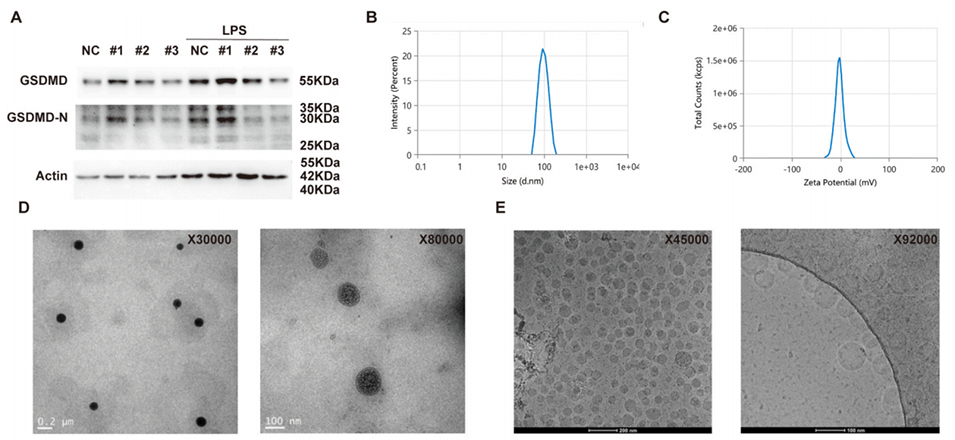 3、筛选出沉默效率最高的siGSDMD序列(#3),以DLin-MC3-DMA、DSPC等为脂质材料,通过CA/SAR/C1芯片一步制备siGSDMD-LNPs。这些颗粒粒径约94nm、PDI≈0.1,在PBS、血清中稳定性良好,4℃储存9个月理化性质无显著变化,且能保护siRNA免受降解。