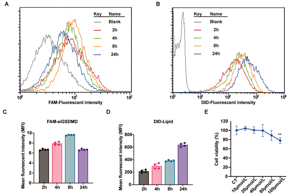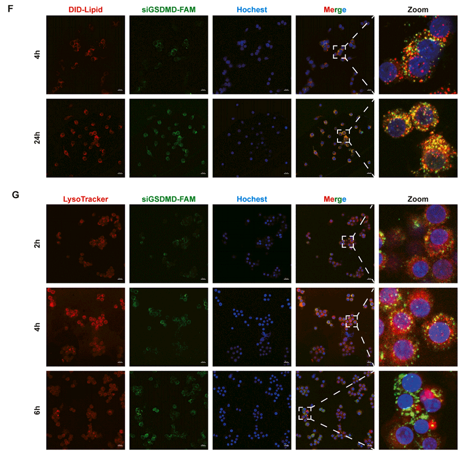 图 7:siGSDMD-LNPs 在骨髓来源巨噬细胞(BMDMs)中的细胞内转运过程。(A-D)BMDMs 与 siGSDMD-LNPs(脂质用 DID 标记,siGSDMD 用 FAM 标记)共孵育,分别在 2、4、8、24 小时通过流式细胞术检测 DID 标记脂质与 FAM 标记 siGSDMD 的荧光强度(n=4);(E)通过 CCK8 法检测 BMDMs 与不同浓度 siGSDMD-LNPs 共孵育后的细胞活力;(F)激光共聚焦显微镜(CLSM)图像显示 BMDMs 对 siGSDMD-LNPs 的摄取情况(siGSDMD 用 FAM 标记,呈绿色;LNPs 中的脂质成分用 DID 标记,呈红色;细胞核用 Hoechst 33342 染色,呈蓝色);(G)CLSM 图像显示 siGSDMD-LNPs(FAM 标记 siGSDMD)在 BMDMs 中 2、4、6 小时的细胞内转运情况(siGSDMD 用 FAM 标记,呈绿色;溶酶体用溶酶体示踪剂 LysoTracker Red 染色,呈红色;细胞核用 Hoechst 33342 染色,呈蓝色)。