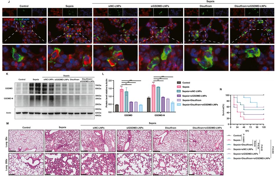 图 10:肺内给药 siGSDMD-LNPs 可减轻脓毒症小鼠的炎症反应与肺损伤。(A)体内药效学研究的给药方案;(B-D)通过 ELISA 检测经 siGSDMD-LNPs 或双硫仑(disulfiram)处理的脓毒症小鼠血浆中炎症因子水平(n=4);(E-I)通过 RT-qPCR 检测脓毒症小鼠肺组织中 GSDMD 及炎症因子的 mRNA 表达水平(n=4);(J)肺组织中 GSDMD 与巨噬细胞标志物 F4/80 的免疫荧光染色图;(K-L)通过蛋白质印迹法检测肺组织中 GSDMD 与 GSDMD-N 的蛋白表达水平;(M)经 siGSDMD-LNPs 或双硫仑处理的脓毒症小鼠肺组织苏木精-伊红(H&E)染色图;(N)经致死剂量脂多糖(LPS,50 mg/kg)诱导的脓毒症小鼠,在接受 siGSDMD-LNPs 或双硫仑治疗后的生存率曲线。