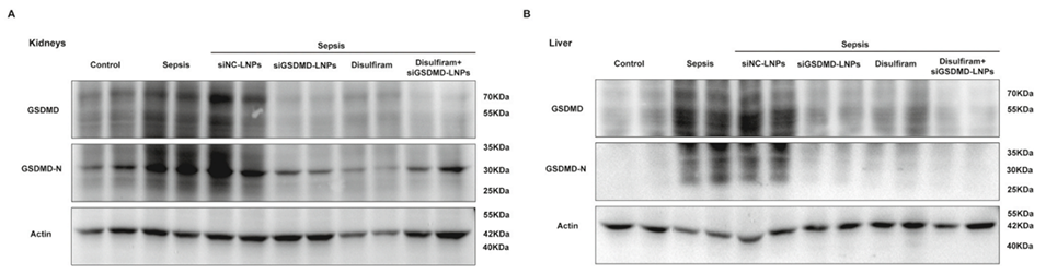 图 11:肺内给药 siGSDMD-LNPs 通过下调 GSDMD 表达抑制脓毒症相关的肾损伤与肝损伤。(A-D)通过蛋白质印迹法分析肾组织与肝组织中 GSDMD 与 GSDMD-N 的蛋白水平;(E-N)通过 RT-qPCR 检测肾组织(E-I)与肝组织(J-N)中 GSDMD 及炎症因子的 mRNA 表达水平(n=4);(O)经 siGSDMD-LNPs 或双硫仑处理的脓毒症小鼠肾组织与肝组织的 H&E 染色图。