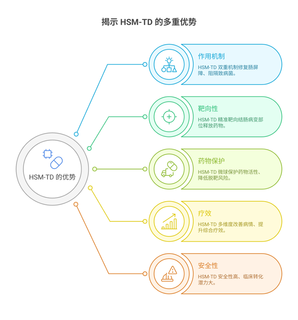 5、从机制上讲,HSF可在结肠黏膜表面形成一种仿生黏液样屏障,阻止致病菌及毒素侵袭;TD则通过上调紧密连接蛋白及MUC2的表达,修复受损上皮屏障,为IBD治疗提供了新策略。