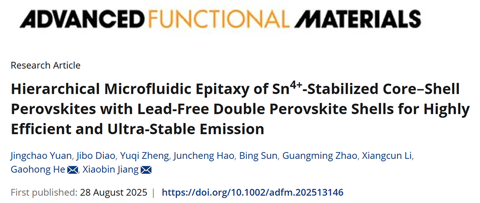 近期,大连理工大学贺高红教授和姜晓滨教授团队开发了一种多级微流控外延生长新策略,成功制备出Sn⁴⁺稳定的核壳钙钛矿材料,该材料以无铅双钙钛矿为壳层,有效解决了传统卤化铅钙钛矿纳米晶存在的成核难控、结构不稳定及铅毒性等问题。研究团队通过该策略实现了对钙钛矿结构参数与核壳构型的精准调控,显著提升了材料的发光效率与环境稳定性,同时具备规模化生产潜力。相关研究以“Hierarchical Microfluidic Epitaxy of Sn4+‐Stabilized Core–Shell Perovskites with Lead‐Free Double Perovskite Shells for Highly Efficient and Ultra‐Stable Emission”为题目,发表在期刊《Advanced Functional Materials》上。
