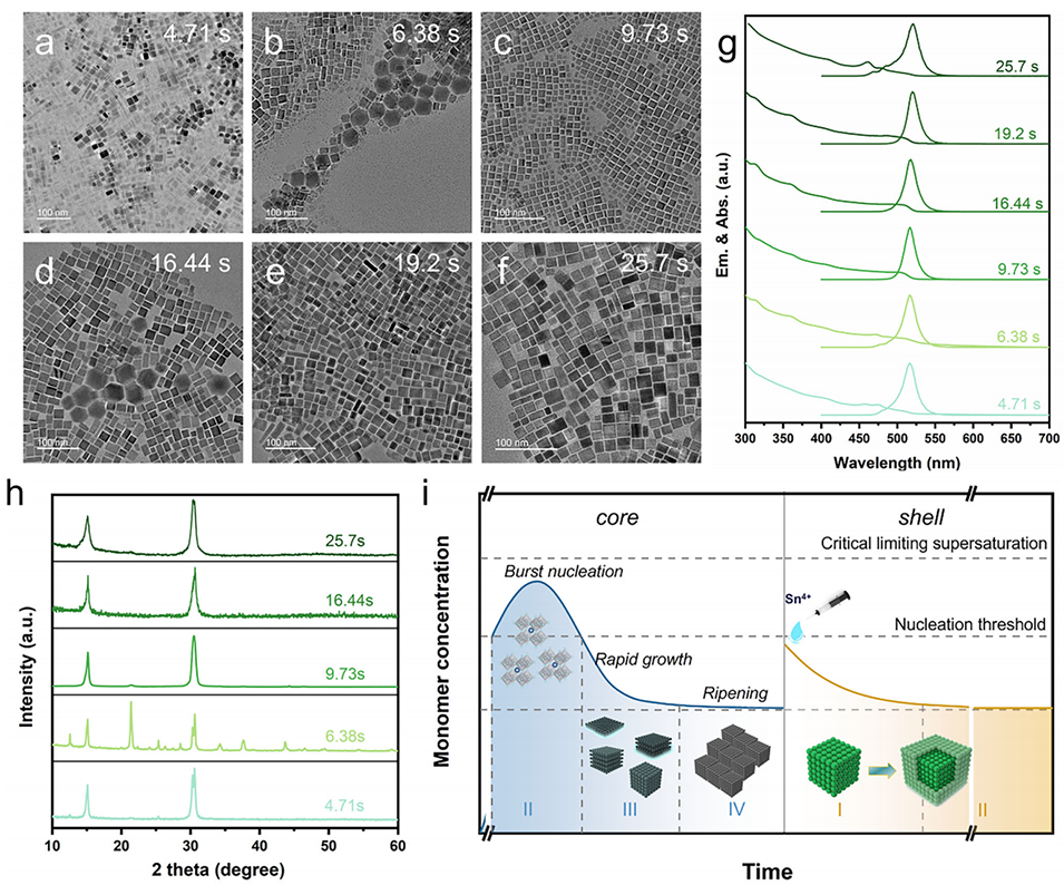 图3. 180°C流动合成中停留时间对CsPbBr₃纳米晶形貌及光学性能的影响。a-f)不同停留时间下获得的纳米晶的TEM图像;g)对应纳米晶的紫外-可见吸收光谱与光致发光光谱;h)180°C流动合成中不同停留时间下CsPbBr₃纳米晶的XRD图谱;i)成核与壳层生长解耦模型(基于LaMer理论的改进模型)。