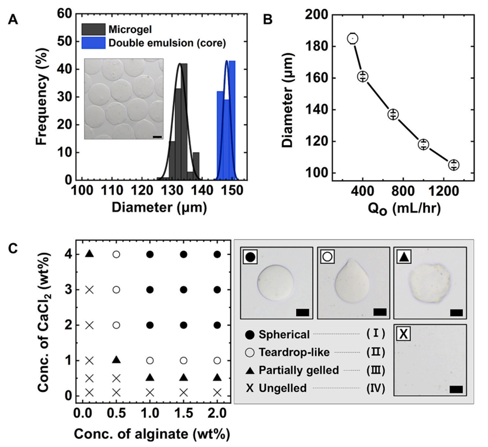 图2. 通过流动条件与组分调控海藻酸盐微凝胶的尺寸及形态。