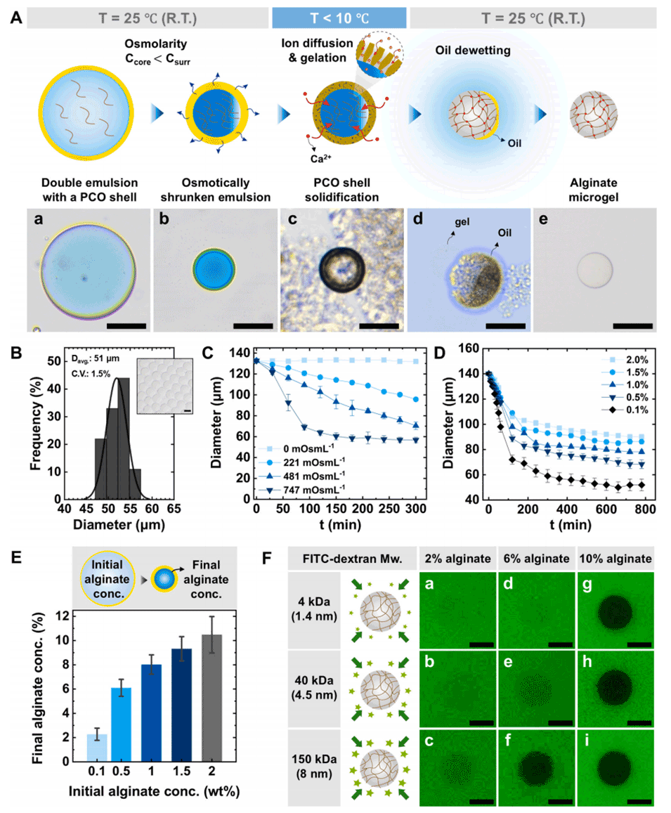 图3. 利用渗透收缩实现海藻酸盐微凝胶的组分调控。