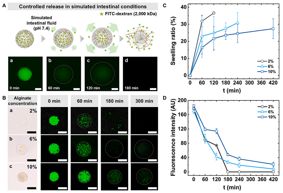 图4. 海藻酸盐微凝胶在模拟肠道环境中的控释行为。