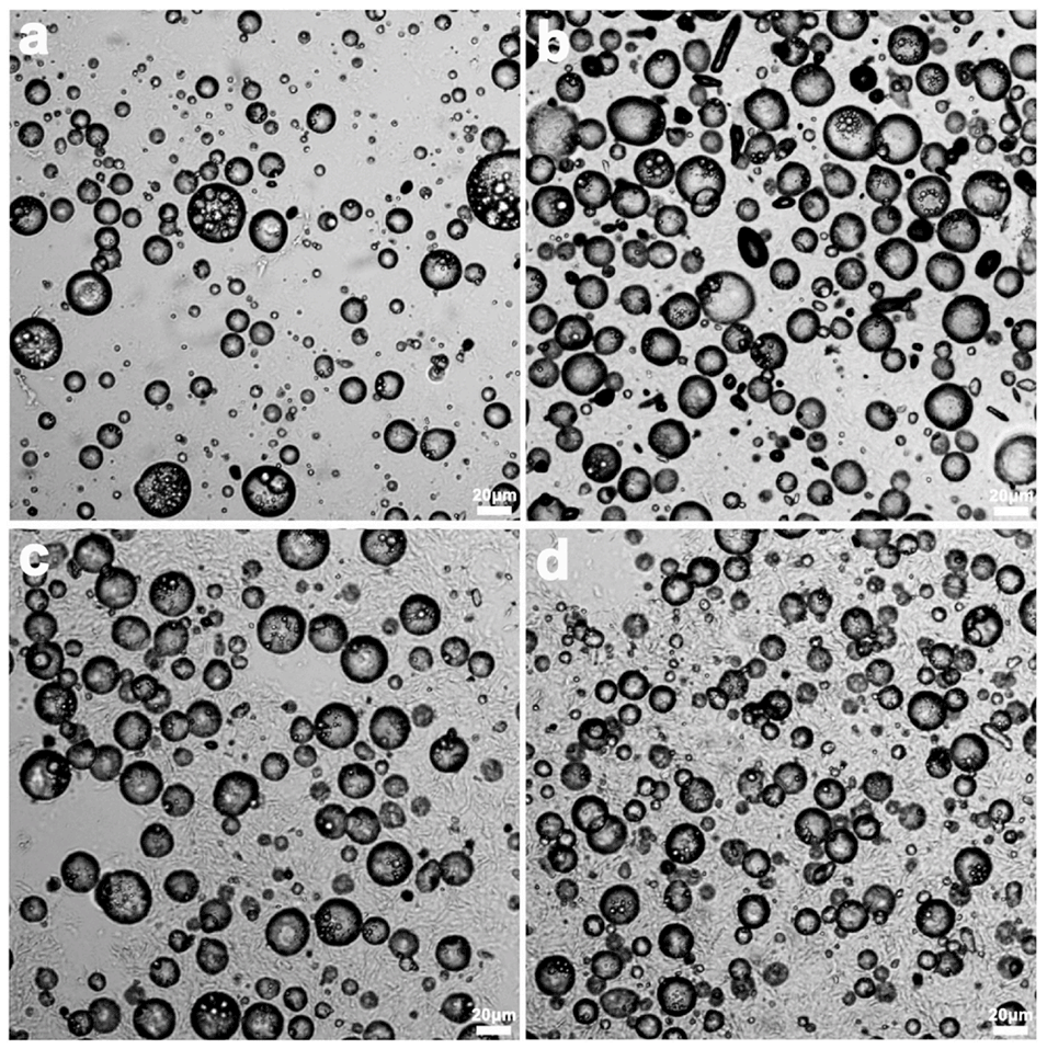 图5. 不同O/W乳液体积分数制备的O/W/O双乳液光学显微镜图。(a)10%(v/v)、(b)25%(v/v)、(c)40%(v/v)、(d)55%(v/v)。蜂蜡含量为6wt%。比例尺为20μm。