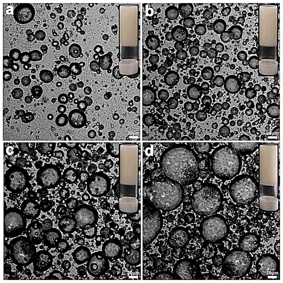 图7. 不同O/W乳液体积分数的O/W/O双重乳液经60℃加热3分钟并冷却至室温后的光学显微镜图像及宏观外观图。(a)10%(v/v)、(b)25%(v/v)、(c)40%(v/v)、(d)55%(v/v)。蜂蜡含量为6wt%。比例尺为20μm。
