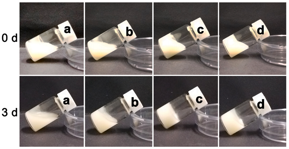 图9. 不同O/W乳液体积分数的O/W/O双重乳液在室温下放置3天后的外观图。(a)10%(v/v)、(b)25%(v/v)、(c)40%(v/v)、(d)55%(v/v)。蜂蜡含量为6wt%。