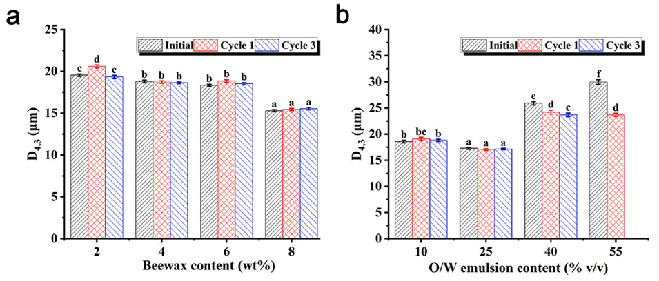 图10.(a)不同蜂蜡含量(明胶含量为3wt%的O/W乳液体积分数为10%(v/v))和(b)不同O/W乳液体积分数(蜂蜡含量为6wt%)制备的O/W/O双乳液,在初始状态及经过3次冻融循环后的液滴尺寸。
